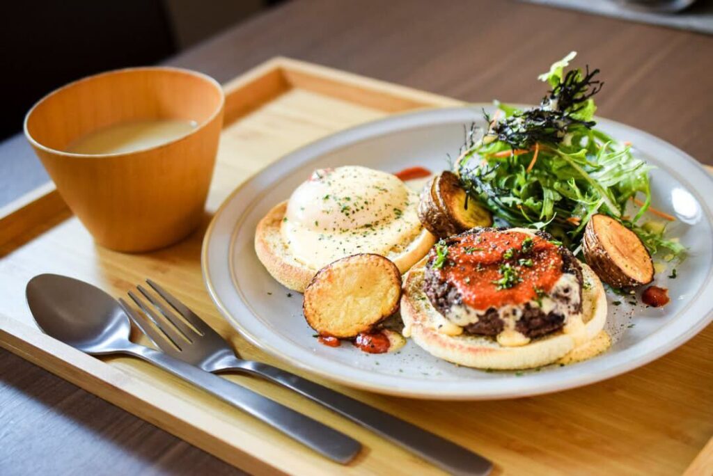 トマトソースはほんのりスパイシーに、卵のソースはオリーブオイルで軽さを出し、アメリカ料理のエッグベネディクトを重たくならないようにやさしく仕上げました。