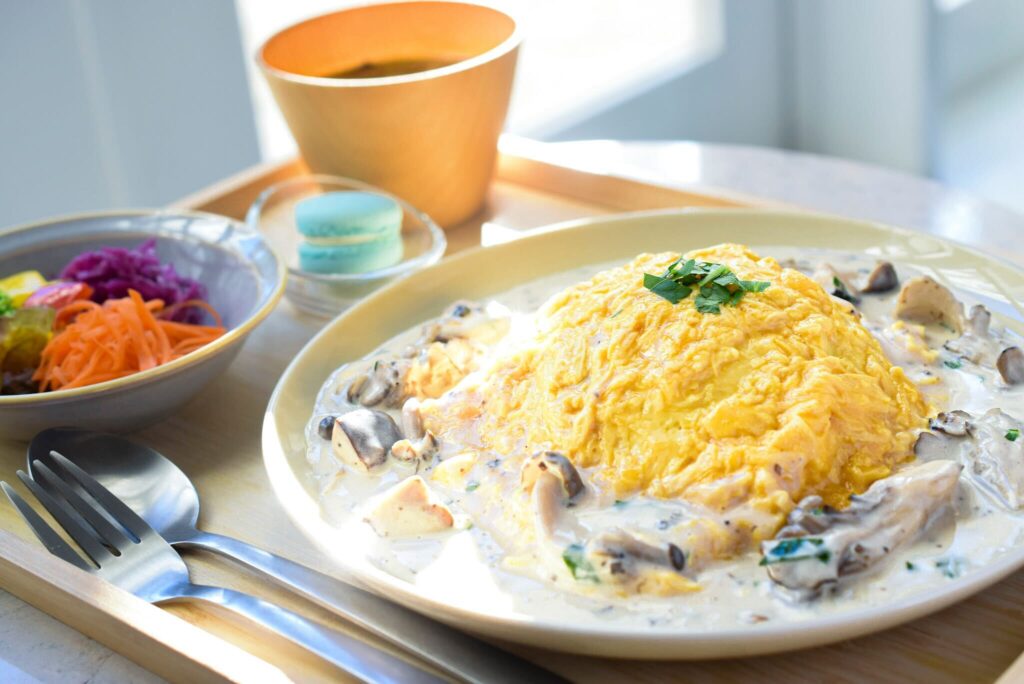 炒めたきのことホワイトソースに、トリュフの香りが広がる贅沢なオムライス。