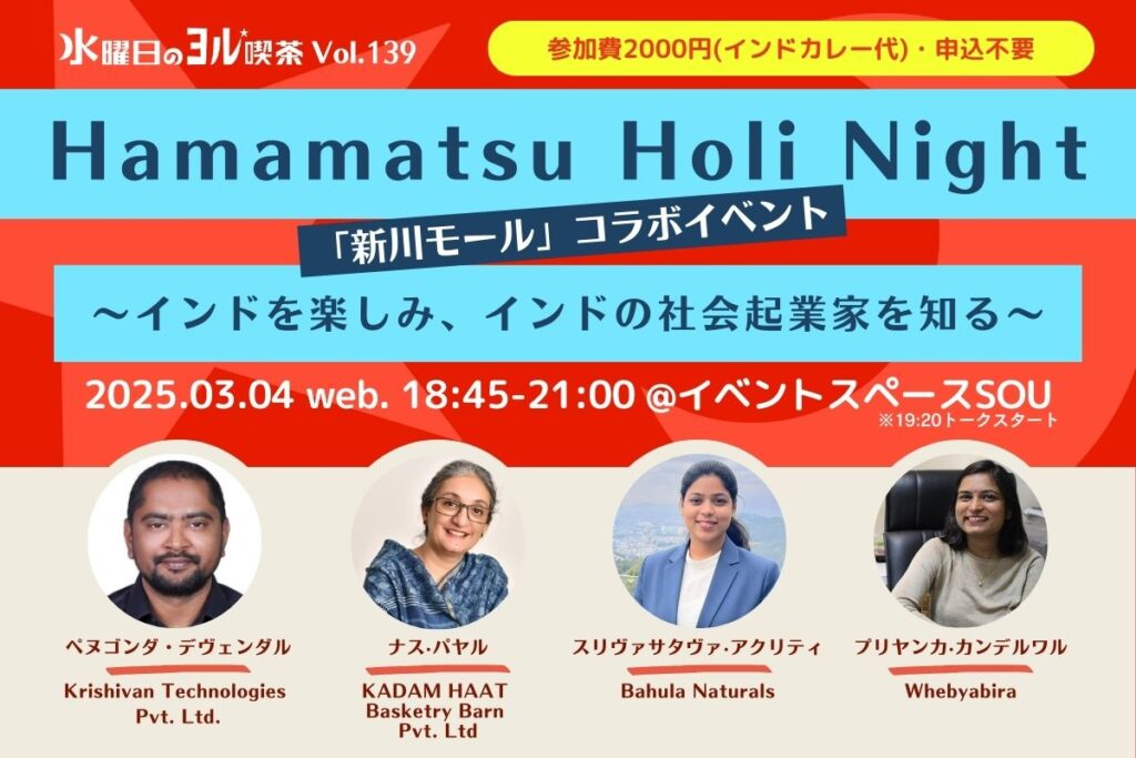 新川モールで「ホーリー祭」を同時開催し、ゲストの話だけでなくインドのお祭りも楽しめるいつもと違った水曜日のヨルを体感できます。